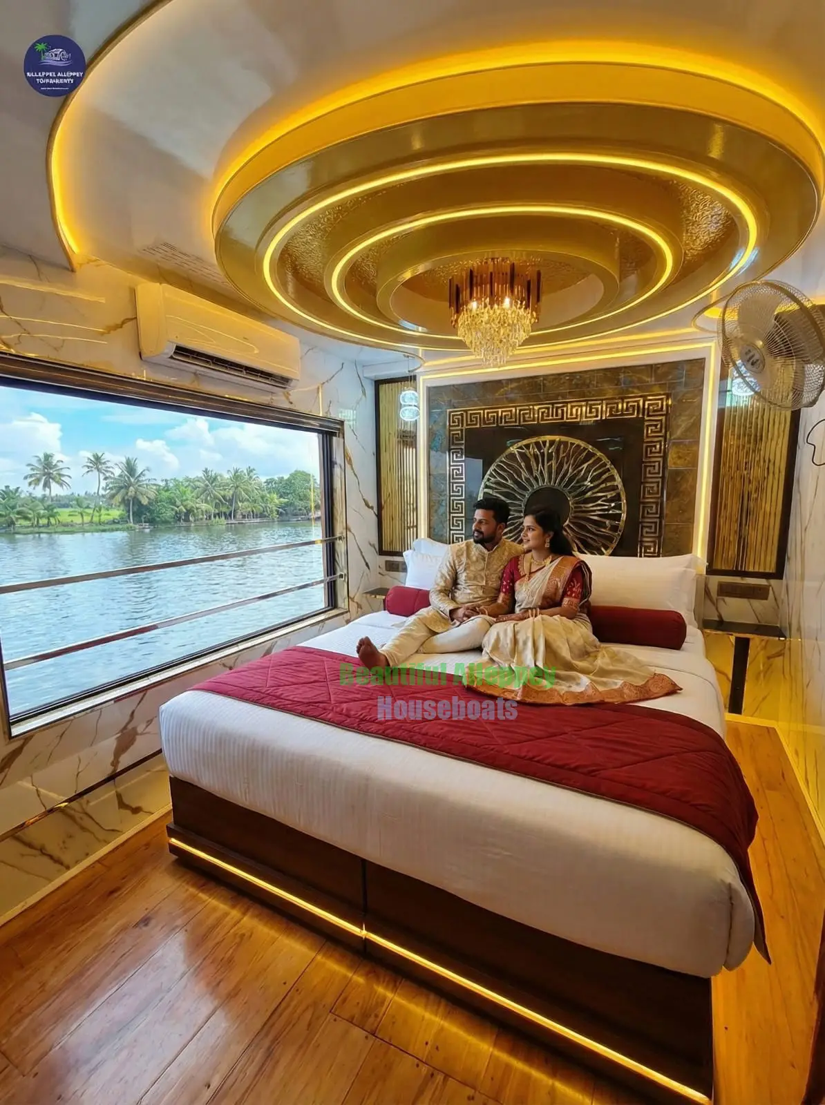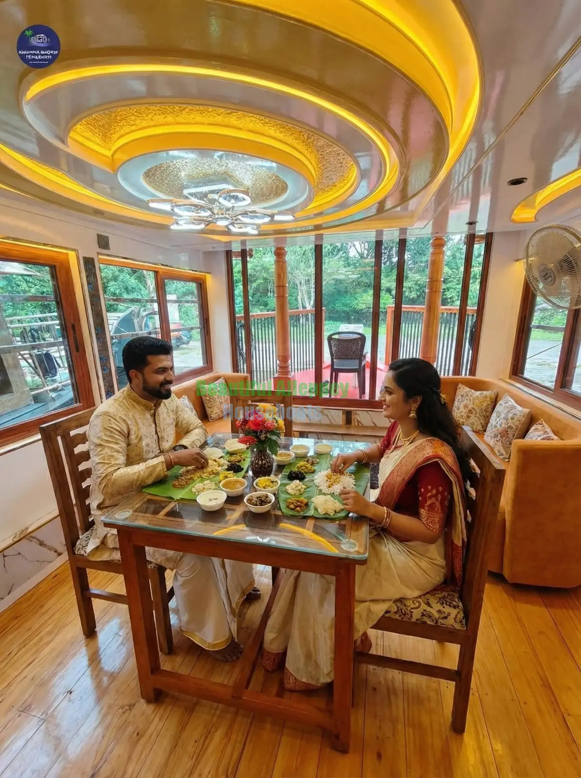 Your stay includes freshly prepared Kerala-style meals cooked onboard by our expert chef, ensuring a homely and authentic dining experience. With full-time A/C, clean interiors, and a calm ambience, this premium houseboat creates the perfect setting for a honeymoon or a quiet getaway.